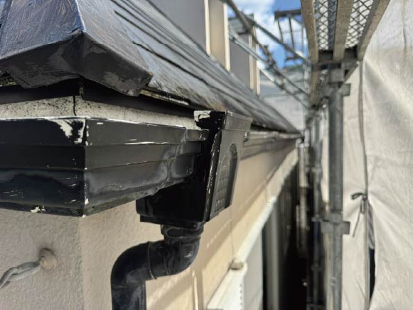 今回は屋根工事をご依頼いただいたため、足場設置に合わせて雨樋の点検もさせていただきました。