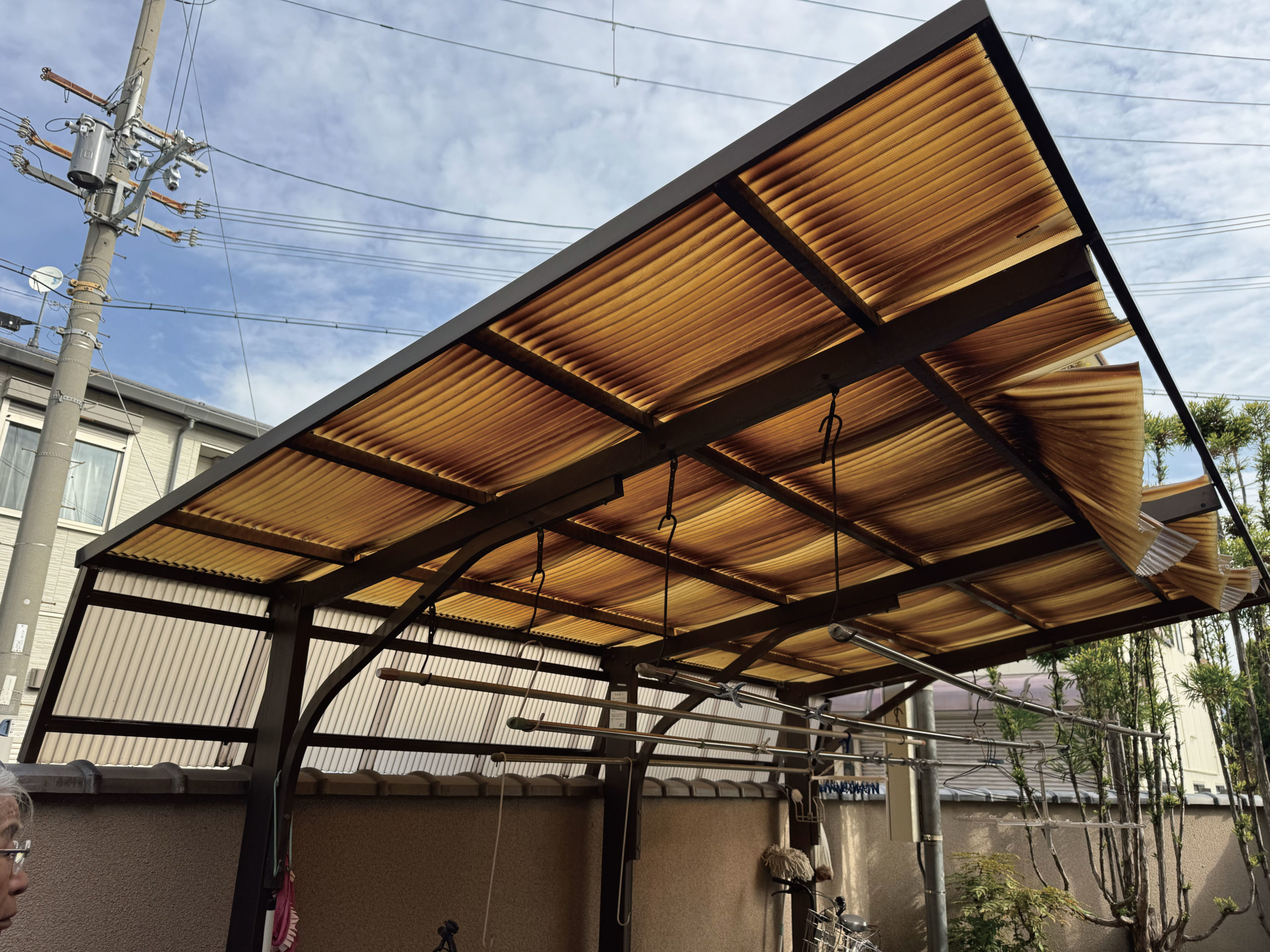 既存の波板が経年劣化により変色・たわみが出ており、強風時のバタつきや飛散の心配がある状態でした。